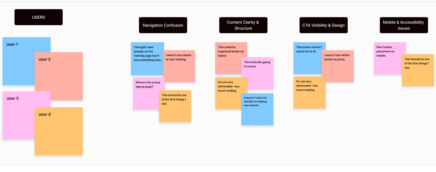 We conducted one-on-one interviews with animal shelter staff and volunteers to understand their goals, frustrations, and behaviors. These conversations revealed that users often struggled to find basic resources, felt overwhelmed by the cluttered layout, and were unsure which actions to take first.